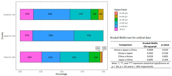Figure 8 illustrates the percentage of studies published in journals with different JIF levels and the results of the Kruskal–Wallis test among Korea, Japan, and China. In Japan, half of the articles were published in journals with 1 < JIF ≤ 2, and there was no article published in a journal with JIF > 3. Korea obtained 40% of articles published in journals with JIF > 2. 51% of studies published in journals with JIF > 2 made China significantly surpass the other two countries in terms of scientific quality. However, it is notable that China also accounted for a larger percentage of studies published in journals with JIF ≤ 1 than the other two countries. Despite some differences between Korea, Japan, and China, the Kruskal–Wallis test produced statistically insignificant results in all cases: Korea vs. Japan vs. China, China vs. Japan, Japan vs. Korea, and Korea vs. China.