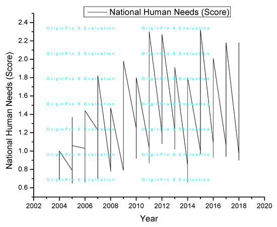 Figure 1 depictsthe fluctuations in basic needs in the US in the period 2004–2018. The oscillations range from 0.7 to 2.4. The highest HNI score, 2.35 on average, indicates the maximum requirements in the years 2011, possibly linked to the one-year worst drought in the US, the lowest HNI score (0.7) in 2004, indicating minimum needs. However, the HNI score might be notably smaller at the national level [