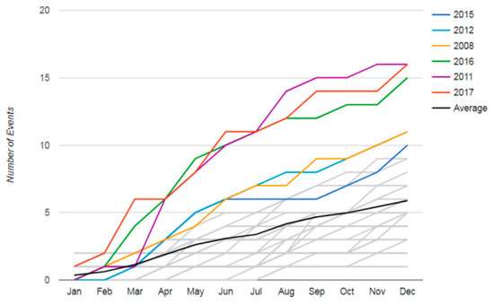 Figure 3 illustrates the monthly numbers of extreme events in the US. It can be observed that every year, the number of extreme events gradually increases from spring to half of the winter (summer, fall inclusive). Furthermore, a higher number of events have occurred during 2011, 2016, and 2017.