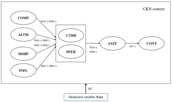 Altruism is exhibited in situations in which people experience internal enjoyment by helping others voluntarily [14,47,48]. Altruism is defined as a voluntary action to help others improve their welfare without the expectation of returns [39]. The knowledge that contributes to others’ welfare motivates altruistic people with intrinsic enjoyment and satisfaction [8]. Fang and Chiu [39] found that members’ altruism influenced intentions to continue KS positively. Ma and Chan [49] argued that altruism provides an essential condition for KS by reducing conflict and promoting participation. Members with higher levels of altruism will be more willing to contribute their knowledge to others and will be more likely to intend to seek others’ knowledge due to the pleasure of participating in the CKN. Consequently, the following hypotheses are proposed.