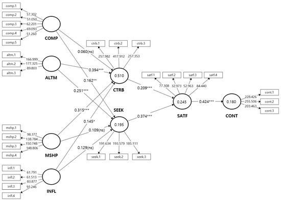 Detailed results are as follows. Firstly, let us check the antecedents of knowledge contributing intention. Altruism (β = 0.394, p < 0.001), feelings of membership (β = 0.315, p < 0.001), and feelings of influence (β = 0.145, p < 0.05) had significantly positive effects on knowledge contributing intention. Secondly, let us think about the antecedents of knowledge seeking intention. Sense of competition (β = 0.162, p < 0.01) and altruism (β = 0.251, p < 0.001) had significantly positive effects on knowledge seeking intention. Thirdly, let us investigate KS attitudinal processes leading to KS continuance intention. Knowledge contributing intention (β = 0.209, p < 0.001) and knowledge seeking intention (β = 0.374, p < 0.001) had significantly positive effects on KS satisfaction, and KS satisfaction (β = 0.424, p < 0.001) had a significantly positive relationship with KS continuance intention.