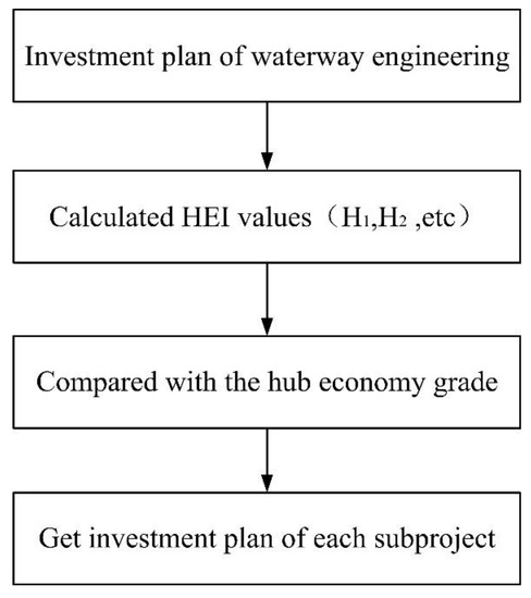 The traditional investment decision-making process is mainly about fund implementation, fund allocation model and fund allocation. In this paper, HEI is introduced into the process of investment decision-making, combined with the current situation of capital allocation, and HEI is introduced into the process of capital allocation model to meet the needs of sustainable development of the project. The investment decision-making process in waterway engineering was discussed by experts, and includes three aspects: First, an investment plan for waterway engineering is needed, and the capital has to be raised; second, an HEI calculation model of waterway engineering is established, and the HEI values of the whole and each subitem are calculated according to the model; finally, the calculated HEI values are compared with the hub economy grade table to get an investment plan for each subproject. Figure 1 shows the workflow of the waterway engineering investment process used in this study.
