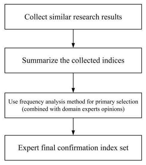 As can be seen from Figure 3, the transportation industry is composed of the water transportation industry, the highway industry, the railway industry and the aviation industry. This paper mainly studies the investment decision-making of the water transportation industry. As the water transportation industry has entered the information age, intelligent transportation systems have played an increasingly important role. Considering the experience of the current project investment, after extensive discussion by experts and engineers, the HEI system is classified into tangible hub indices (H1) and intangible hub indices (H2). At the same time, the social, economic, ecological and other contents of sustainable development are included in HEI quantification indices. In this paper, the selection of indices mainly considers the principles of systematization, a combination of qualitative and quantitative, and operability. The Delphi method and frequency analysis method [43] were used to screen the indices. The specific steps of selecting indices were as follows: (1) Statistics of the indices in domestic and international academic research reports, journals and other materials were carried out by using the frequency analysis method, and the indices with a higher frequency were selected according to certain mathematical statistical methods, and these indices are summarized in order; (2) according to the characteristics of waterway engineering, opinions of domain experts were sought and indices were supplemented and improved; and (3) after the final confirmation by experts, the final index set after screening was obtained. Figure 4 shows the waterway engineering index system screening process.