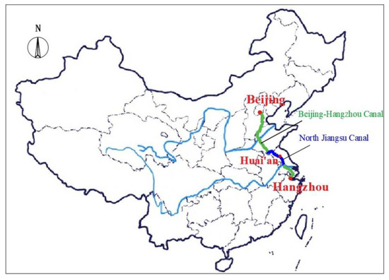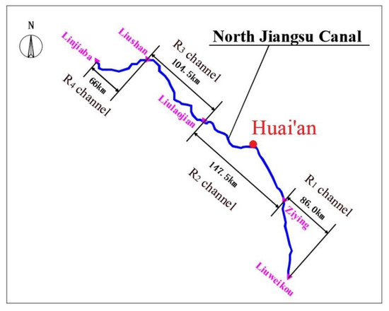 The North Jiangsu Canal is located in the middle of the Beijing‒Hangzhou Canal, starting from Linjiaba in Xuzhou City in the north and ending at Liuweikou in Yangzhou City in the south, with a total length of 404 km and a total water level drop of 31 m. It is a comprehensive channel with the highest level (Level 2 channel) in the accessible reach of the Beijing‒Hangzhou Canal and with the most benefits. It can be used for the navigation of 2000-ton ships. In recent years, the average annual cargo was more than 300 million tons, and good economic benefits have been achieved through water transportation. The location is shown in Figure 5.