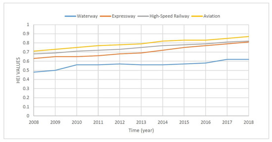 In order to understand the position of waterway engineering in the hub economy and optimize investment behavior in transportation systems, this paper selects a representative expressway, a high-speed railway and aviation engineering for analysis. The calculation method is the same as that for the waterway engineering HEI. Different industries choose corresponding indices after extensive discussion by experts and engineers; the details are as follows: (1) expressway engineering, H1 (Damaged length of highway, Quantity of bridge maintenance, Failure rate of mechanical equipment, Failure rate of electrical equipment, Number of intelligent supervision devices), and H2 (Number of intelligent software, Toll station traffic efficiency, Qualified rate of regular training for employees, Greening rate of Expressway, Driver satisfaction); (2) high-speed railway engineering, H1 (Line maintenance length, Building maintenance quantity, Failure rate of mechanical equipment, Failure rate of communication equipment, Number of intelligent supervision devices), and H2 (Number of intelligent software, Punctuality rate, Qualified rate of regular training for employees, Railway greening rate, Passenger satisfaction); (3) aviation engineering, H1 (Runway maintenance length, Green maintenance area, Failure rate of mechanical equipment, Failure rate of electrical equipment, Number of intelligent supervision devices), and H2 (Number of intelligent software, Punctuality rate, Qualified rate of regular training for employees, Greening rate of Airport Road, Passenger satisfaction). Figure 7 shows the variation trends in the HEI for various industries from 2008 to 2018.