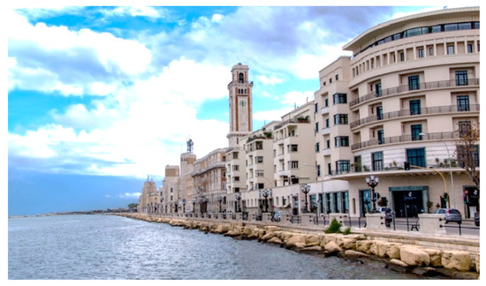 The natural capital of Bari can be referred to a number of consolidated aspects, such as (i) The sea, which is embedded in the culture and economy of the city; (ii) the nine blades, organized in a complex ecological system (Figure 1); (iii) areas of archaeological interest and public parks located in different districts. The cultural and social capital can be represented by (iv) the historical pre-existences offered in the city center by houses dating back to the Byzantine era (Figure 2); (v) the lictor architecture developed during fascism in the peripheral center and on the waterfront (Figure 3), and the architecture of twentieth-century rationalism in the peripheral districts (PPTR Puglia 2009) [28].
