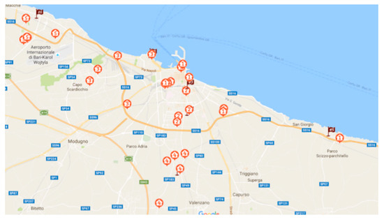 While it is easier to trace the benefits for the well-being of humans and of the ecosystems offered by the natural factors (such as, for example, the role of urban green that can regulate the climate by absorbing carbon dioxide and supporting the recycling of nutrients and the formation of soil or attract people for leisure and tourism), it is harder to associate the benefits offered by the built landscape, despite building issues are central to the public discontent with natural resource management decisions [29]. Therefore, setting up a participatory process in the identification and evaluation of ES is an increasing issue in planning agendas. Starting from resolution nr. 565/2015 in 2015 Bari Department of urban planning started a participatory process at several levels, asking citizens to participate in the drafting of the master plan of the city (PUG) [30]. The path was designed in different time steps, performed between May and November 2016, through (i) nr.30 urban front offices (UFOs) activated in the municipal area (Figure 4), (ii) nr.9 civic walks (CWs) to single out peculiar aspects and features of relevant areas (Table 2; Figure 5 and Figure 6), and (iii) nr.5 public workshops (PW). Located in different parts of the city (Figure 4), UFOs have supported the participatory process through the distribution of surveys regarding the themes of (i) public space, (ii) landscape, and (iii) mobility; CWs aim to share new visions of the places [31]. Analysts have chosen nine CWs in order to highlight the peculiarities of each area (Table 2); experts knowledge (institutional referents and technicians) and non-expert knowledge (citizens) have been included in order to present observations, questions, and desires. PWs aimed at expanding the dissemination of participation culture in urban policies, through the proposal of some open meetings to citizenship on relevant urban topics.