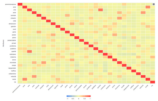 The first “cleaning” phase follows the following steps: (i) Tokenization, able to select the main words (tokens) included in a document according to a frequency logic; (ii) the identification of “Stopwords” in order to delete all the irrelevant words listed in the dictionaries provided by the system (deriving from the Italian dictionary); (iii) stemming, able to reduce the number of words that share the same root as a given token. The pieces of information emerging from the cleaning process are grouped into a correlation matrix (Figure 12) representing the second phase.