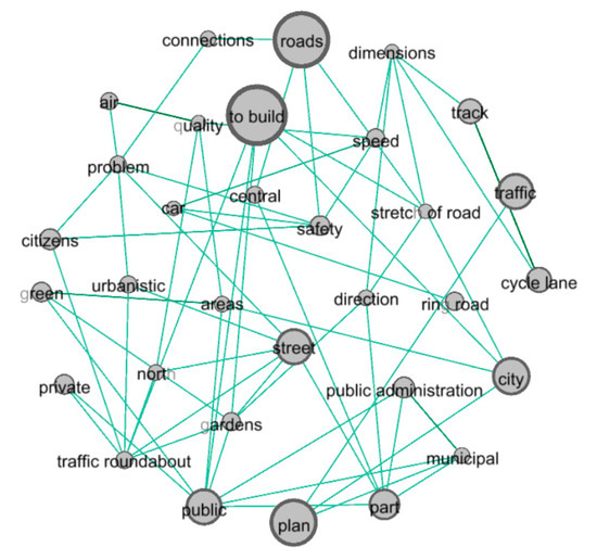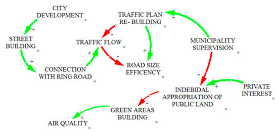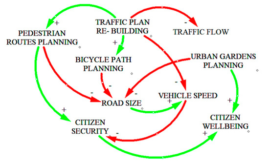 From the CLD referring to Place 1, two main themes emerged: (i) excessive vehicular traffic and (ii) the lack of public green spaces (Figure 14).