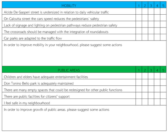 SSIs have been structured in three sections: (i) citizen profiles, (ii) mobility issues, and (iii) public space issues. Citizens could express own preferences on a Likert (1932) 1–5 scale of agreement and to insert a free contribution on the actions to be addressed on the issues raised (Figure 16). A sample of 88 citizens, divided into 53 women and 35 men, aged between 35 and 50 years, were interviewed.