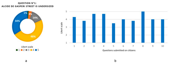 A total of 48% of citizens involved expressed an agreement at Likert scale 4, whereas 34% of citizens agreed at grade 5 (Figure 17a). Most citizens involved acknowledges that Alcide De Gasperi street is undersized. It is possible to summarize the results obtained from the questionnaire through a histogram in which the abscissas represent the questions, and the ordinates represent the average of citizens’ preference for each question (Figure 17b).