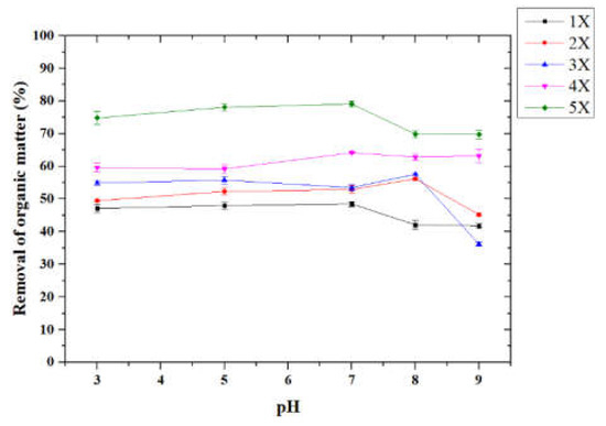 The effect of initial pH value on the removal of organic matter (Experimental conditions: 1X ~ 5X indicate the dosage of H2O2 from 1.03 M ~ 5.15 M, molar ratio [H2O2]/[Fe2+] of 1000, reaction time of 3 h, 5 g SS in 200 ml distilled water).