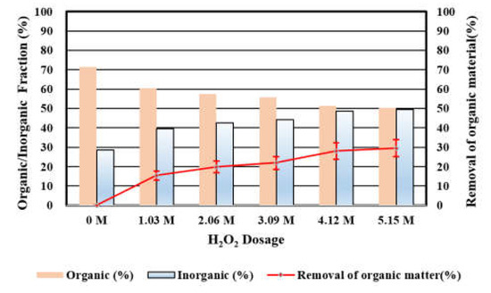 The effect of H2O2 dosage on the removal of organic matter and the organic/inorganic fraction is shown in Figure 3. With the increase in H2O2 dosage, the removal of organic matter increased. In addition, the organic fraction decreased whereas the inorganic fraction increased, which implied the removal of organic matter. When the H2O2 dosage was higher than 4.12 M, the removal of organic matter and the organic/inorganic fraction had no significant change. The removal of organic matter reached 29.5% when the H2O2 dosage was 5.15 M. In addition, the organic and inorganic fraction were almost the same (50.4% and 49.6%, respectively).