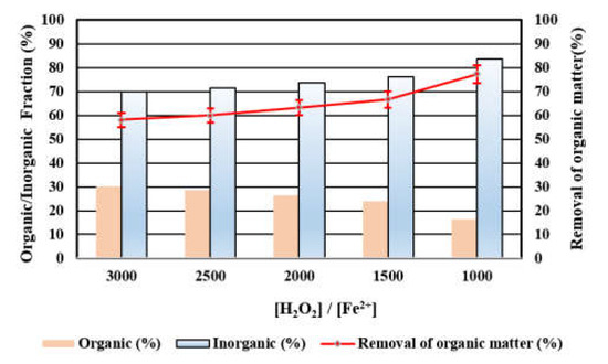 The effect of [H2O2]/[Fe2+] molar ratio on the removal of organic matter and the organic/inorganic fraction is shown in Figure 4. When the H2O2 dosage was fixed at 5.15 M, the removal of organic matter increased with the decrease in [H2O2]/[Fe2+] molar ratio from 3000 to 1000. In addition, the organic fraction decreased whereas the inorganic fraction increased, which implied the removal of organic matter. The removal of organic matter achieved 77.2% when the Fe2+ dosage was 5.15 mM and the [H2O2]/[Fe2+] molar ratio was 1000. Meanwhile, the organic and inorganic fraction was 16.3% and 83.7%, respectively. The difference between the organic and inorganic fraction reached a maximum level.