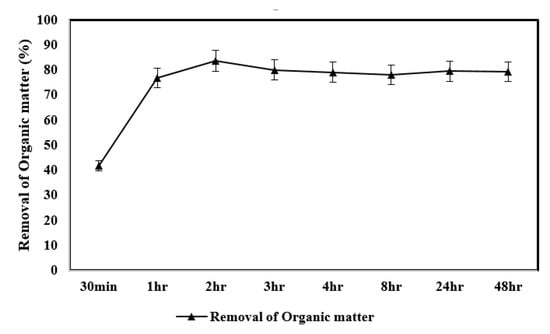 The effect of reaction time on the removal of organic matter is shown in Figure 5. With the dosages of 5.15 M H2O2 and 5.15 mM Fe2+ at pH 7, the removal of organic matter increased with reaction time until 2 h. There is no significant change in the removal of organic matter after 2 h. The maximum removal of organic matter 83.7% was reached at 2 h.