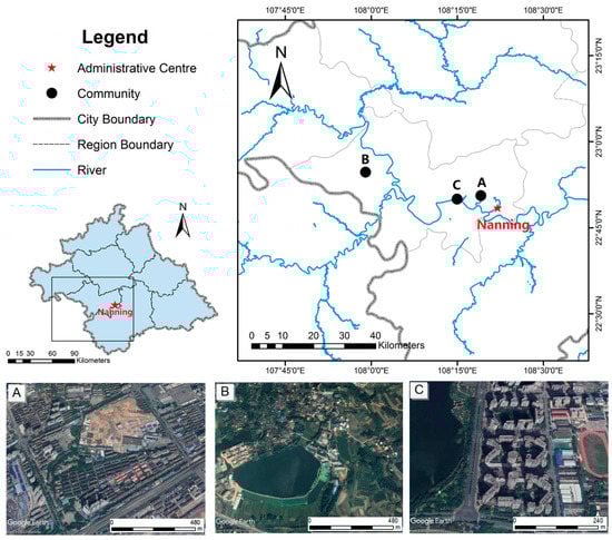 Nanning is located in the south of China, with an annual average rainfall of about 1300 mm. Yong Jiang River is the largest river in this city, with an annual average runoff discharge of 4.18 × 107 m3. According to historical data, there were 19 urban flood events with peak flow discharges of more than 1.11 × 104 m3/s from 1907 to 2000. For example, the rainstorm hazards in July of 2006 resulted in large areas of waterlogging in Nanning, that is, 66 streets were flooded with 0.5–3 m depths of water, leading to a huge economic loss and serious environmental and social problems. In terms of the social development degree, the three communities that are selected as the study area in this paper (Figure 1) are (A) Guangxi University of Chinese Medicine, (B) the Zhuhu village and (C) the Daxuenan neighborhood. Guangxi University of Chinese Medicine is an old community with historical buildings; it is regarded as a key waterlogged point in Nanning city due to its poor drainage and low-lying land; contrarily, the Daxuenan neighborhood is a newly built community located prone to Xiangsihu River, with a brand-new drainage system and smart layout, and the Zhuhu village is a remote community that continually suffers severe waterlogging, which causes misery to the villagers. Thus, the three selected communities are of different types, with different drainage facilities and different flood defense standards, and are confronted with the different challenges of urban floods.
