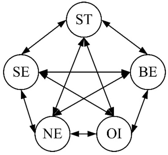 Sharifi (2016) established the disaster resilience indicators for the Tan-sui River, which is located in the Taipei metropolitan area surrounded by lakes and rivers and suffers from frequent typhoons and floods, as it is affected by the monsoon climate. With similar natural and social conditions, five dimensions including 13 indicators were identified as the original framework in this study, which are the same as those in reference [33]. In order to assess the community resilience to urban floods, a framework with five dimensions is adopted in this study, including science and technology (ST), the built-environment (BE), organization and institutes (OI), the natural environment (NE), and social–economic status (SE). The indictor system has a multi-hierarchy, as a simplified and new framework of indicators is proposed in this study. Assuming all the dimensions are interdependent, the original framework is shown in Figure 2, which is based on reference [33]. For example, if the resilience of science and technology is promoted, the performance of the built-environment, organization and institutes, the natural environment, and social–economic status would be increased; thus the arrow points from ST to BE, OI, NE, and SE. The relations are displayed similarly in other dimensions; thus, the two-way arrows are marked in Figure 2. The key advantages of this framework include the following: it is a complex network with close interlinkages between the five dimensions and it can be applied to any community.