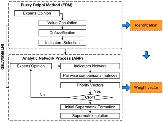 Figure 3 shows the framework of the integrated model in this paper. The dimensions and indicators of community resilience to urban flood are identified first based on the common framework and fuzzy Delphi method (FDM). Then, an evaluation network is constructed with selected indicators. Afterward, the weights of the urban flood community resilience indicators are computed using the analytic network process (ANP) and finally, the ranking of community resilience indicators is generated, as well as the importance of strategies.