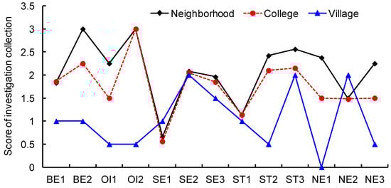 The investigation results of the university and neighborhood communities show the response options in the questionnaires (Figure 4). The total average score was calculated, i.e., 1.8 for the university and 2.13 for neighborhood. The interview records and indicator marks were analyzed for the village, and the total average score was 0.91. Guangxi University of Chinese Medicine had the best resilience in the ST, OI, and SE dimensions, as it is located in an urban area, where the infrastructure has a relatively high quality, and governments provide sufficient rescue once an urban flood occurs. However, this area is not that resilient to the BE and NE dimensions due to its limited pace, flat terrain, and dense buildings. The Daxuenan neighborhood has advanced drainage systems and high elevation, which alleviate the occurrence of severe waterlogging. The Zhuhu village, whose disaster defense construction is still weak, suffers poor resilience in terms of most of the indicators. The priority of community resilience is as follows: the Daxuenan neighborhood, followed by the Guangxi University of Chinese Medicine, and the Zhuhu village, which is relatively weak at recovering from an urban flood.