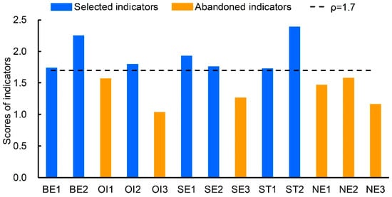 The samples in different communities were collected, and the total score was calculated by the average value. Thus, the final values of BE1 were 1.83, 1.86, and 1 in the neighborhood, college, and village, respectively. If a threshold is set in the interval between 1.6 and 1.7, an obvious cluster of indicators could be detected, shown in Figure 5 and Table 3. In other words, the same simplified indicator system would be generated, irrespective of the value set in the interval between 1.6 and 1.7. Therefore, the indicator system of community resilience would be determined and would display consistency. If a decision-maker requires more indicators, the threshold ρ can be set smaller, and vice versa [27]. With comprehensive consideration of the responders’ linguistic scale and the decision-makers’ efficient management of the community resilience system, seven indicators were accepted in this study, where we set the threshold ρ = 1.7. As shown in Figure 5, the blue bar represents the selected indicators, and the yellow bar represents the abandoned indicators. This process can help local governments to better manage urban flooding risks and better understand the predominant elements of community resilience to urban floods.