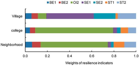 In this study, the four dimensions in the simplified network have no interdependence with each other. The normalized weights were computed and are listed in Table 4. The comparison matrices pass the test with C.R. < 0.1. Then, seven indicators of the simplified evaluation system were compared in the three different communities, and experts were asked “considering the satisfaction of indicator BE1, what is the relative impact of all the indicators on each other?”, and the question was applied to BE2, OI, ST1, ST2, SE1, and SE2 for the three different communities. In order to ensure that the results are reliable and efficient, six experts were selected in this study, including two in the field of flash flood management, two from the hydrology governmental agency, and two from the local community management agency. In the next stage, the supermatrix for compatibility [40] was formed to converge to a long-term and stable set of weights, which presents the results of relative importance, as shown in Appendix A and Appendix B, the supermatrix for compatibility after convergence. Finally, the overall normalized weights of evaluation indicators in the neighborhood, college, and village community were obtained, as listed in Table 5, and a comparison of resilience indicators in communities is shown in Figure 6.