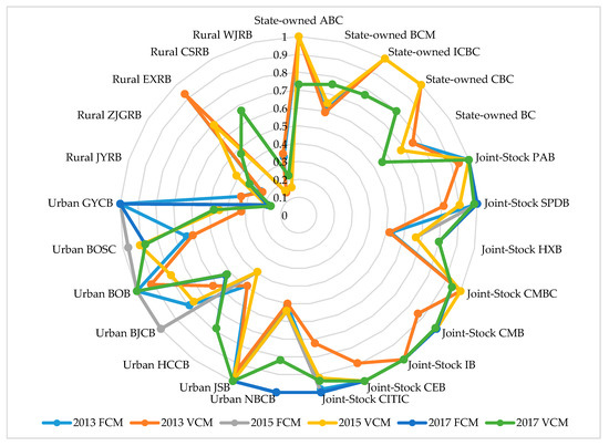 The efficiency values of joint-stock and urban commercial banks were consistently on the rise during the observed period, while those of state-owned banks took on an opposite trend. The efficiency values of the four groups of banks during the observed period in the FCM are shown in Figure 3a. In 2017, the efficiency value of joint-stock banks was 0.9681 and their innovation performance remained in the leading position; whereas urban commercial banks’ product innovation efficiency value had been rising for all three years under observation, overtaking that of state-owned banks (0.7215) to reach 0.8836 in 2017. In the VCM, the same conclusions apply. The efficiency value of state-owned banks under this model was slightly higher than that of their joint-stock counterparts in 2013, but assuming a trend similar to the FCM. This can be seen in Figure 3b.
