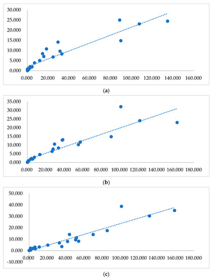 As mentioned in this article, the difference between the FCM and the VCM is whether to consider the synchronous relationship between credit risk and product innovation income. In order to analyze this relationship, this article presents the scatter plots of commercial bank product innovation revenue and risk in 2013, 2015 and 2017, as shown in Figure 4. The data on the ordinate axis represent product innovation revenue, and the data on the abscissa axis represent anticipated non-performing loans. Obvious linear relationships are observed in the scatter plots below. Therefore, the rationality of the assumptions in the FCM model proposed in this paper is also verified.
