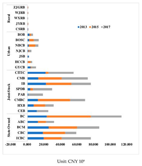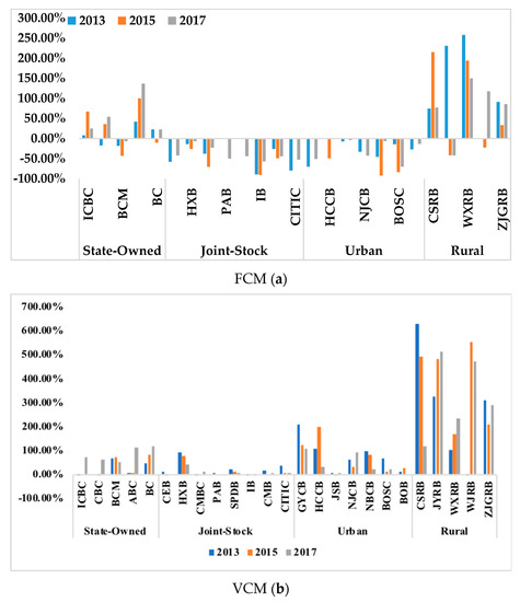 Figure 5a,b show the RII values in the FCM and VCM, respectively, and Figure 6 shows the average RII values of different types of banks during the observed period. Average RII of four types of commercial banks in 2013, 2015 and 2017 can be found in Table 4. According to Figure 5a, in the FCM, the average rates of change of joint-stock and urban commercial banks’ product innovation income were all below 0, indicating that reducing the scale of product innovation may lead to the reduction of both the income and the credit risk associated with innovation. During the observed period, rural commercial banks had the highest RII. Although the average RII of state-owned banks was lower than that of rural banks, the former was apparently on an upward trajectory. Among rural commercial banks, the RII of WXRB was the highest, standing at 200.27%, followed by CSRB’s 122.20%. Among state-owned banks, ABC had the greatest RII increase. This indicates that commercial banks can scale up product innovation by strengthening their product innovation capability.