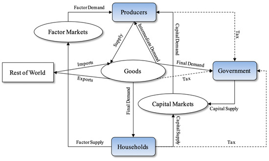 - Households—Households supply labor, consume goods and services, receive income from the supply of labor (different occupational groups), rent from capital, and make transfers between households and other agents. Households also pay interest, taxes, social insurance expenditure, transfer to others, and save from part of their total income. Generally, the heterogeneity of households’ income sources, expenditure, and consumption patterns result in the different impact by the implementation of the carbon tax.