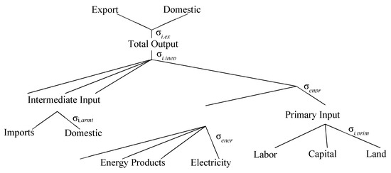 The GEMEET model is solved by choosing the optimized output though the specific production function in terms of the cost-minimization assumption. For the basic structure (Figure 2), the enterprises, government, and households are the major agents in the model. The enterprises produce commodities and services using intermediate and composite energy and primary factor inputs (Figure 3). Each intermediate input can be divided into domestic production and imports. As for the composite energy and primary factor inputs, the energy input contains energy product and electricity, and the primary input includes labor, capital, and land. All the inputs mentioned above can be substituted with each other subject to the constant elasticity of substitution (CES) function. represents the substitution elasticity of the CES production function. The elasticity reflects the degree of substitution relation between these inputs. Then, commodities and services can be sold to households, the government, other domestic enterprises, and the rest of the world. The constant elasticity of transformation (CET) function in the top of the Figure 3 can depict whether the commodities and services are for domestic use or for the rest of the world.