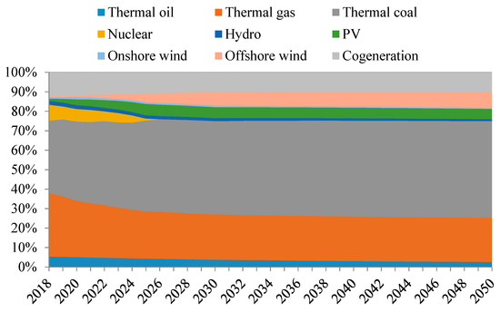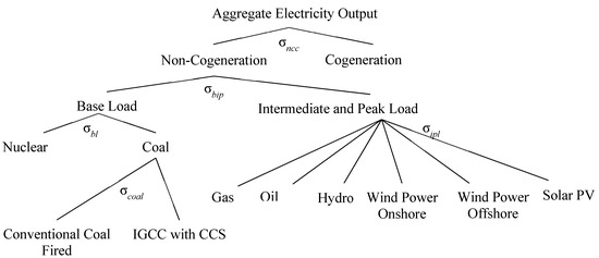The model also covers energy products and electricity, as shown in Figure 4. We also distinguished various electrical-power generation technologies in the model, such as nuclear, coal-fired, gas-fired, oil-fired, IGCC with CCS, hydro, onshore wind power, offshore wind power, and solar PV. These generation technologies were classified into base, intermediate, and peak load in the model based on their characteristics (Figure 4). The base-load power had to meet the base demand of electricity through a stable and continuous power supply and be low cost compared to other power generations. To conform to the real-world situation of electricity generation, nuclear and coal-fired powers were categorized as base-load power, and the lower substitution elasticity was used instead of the intermediate- and peak-load nested structure.