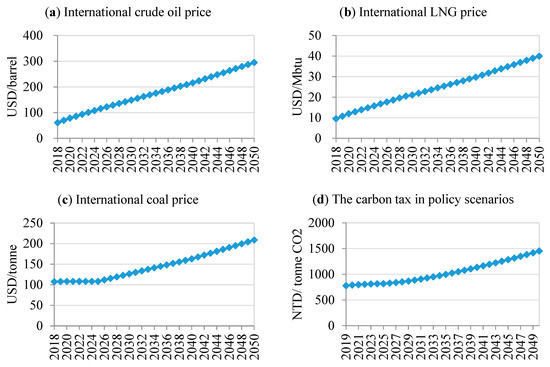 The GEMEET model is benchmarked in 2011, as the latest updated input‒output table available for Taiwan is that from the year 2011. Some important variables such as the GDP, households, exchange rate, and power generation mix are calibrated through a historical simulation from 2012–2017. The projection period is from 2018 to 2050. In the reference scenario, we assumed no carbon taxation in the future. The nuclear power plant will be gradually phased out in 2018, 2023, 2024, and 2025 according to the nuclear-free homeland policy in Taiwan. The targets of renewable energy were also considered in the reference scenario. The policy targets for PV, onshore wind power, and offshore wind power are 20 GW, 1.2 GW, and 3 GW, respectively, by 2025. After 2025, referring to Huang et al. [18], the potential capacity for PV and offshore wind power are larger than the policy target for 2025. Consequently, we assumed that PV and wind power offshore will reach the potential capacity of 30 GW and 9 GW, respectively, in 2050. The nominal international energy price is exogenous in the GEMEET model and estimated with an econometric method based on the projection of the International Energy Agency [19]. Figure 6a–c shows the setting of the nominal international energy price. The autonomous energy efficiency improvement (AEEI) is assumed to be 1% annually. Total factor productivity is assumed by industry according to the historical yearly average (2009–2016). The policy scenarios were the same as the reference scenario except for some assumptions with different scenarios. The detailed assumptions for each policy scenarios were as follows: