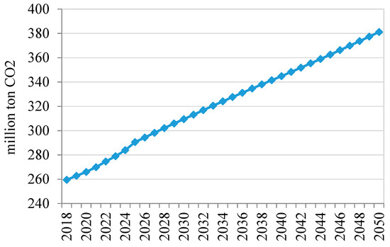 - Carbon tax with no tax revenue recycling (CTN): The implementation of the carbon tax starts from 2019 to 2050. Differently from the other research, the carbon tax in this paper was calculated backward based on the total labor income tax deduction. The carbon tax revenue for each year assumed 38% of the total labor income tax of the reference scenario for the corresponding year. The carbon tax in policy scenarios in the future was decided by using the revenue divided by the CO2 emissions (Figure 6d). To keep tax neutrality, carbon tax and the total value of revenue recycling were the same for each policy scenario. No carbon tax revenue recycling into household and enterprise existed in this scenario.