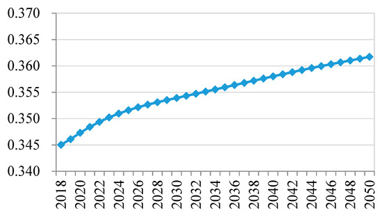 Under the assumptions in the reference scenario, the results of real GDP and economic growth were as shown in Figure 7. Economic growth in Taiwan decreased from 2.6% to 1.25% from 2018 to 2050,and real GDP was about 2.6 trillion NTD (New Taiwan Dollar) in 2050. With the growth in the economy, the emission of carbon dioxide increased in the future (Figure 8). Notably, before 2025, the emissions grew faster than after. Due to Taiwan’s geographical characteristics and limited natural resources, its energy supply relies heavily on imported fossil fuels, which cater for over 90% of the country’s energy demand. The international energy price has a great influence on the domestic energy demand. For the projection of the international energy price in this paper (Figure 6a–c), the coal price was almost in stagnation along with the rising trend of oil and LNG (Liquid Natural Gas) prices before 2025. The increasing demand for coal, because of its lower price compared to that of other fossil fuel energies, may result in a rapid ascent of carbon emissions. The power generation mix (Figure 9) showed the same pattern with the trend of international energy price. This paper also measured the dispersion of income distribution through the GINI index. Using the GINI index in the reference scenario (Figure 10), the income distribution tended to become slowly unequal in 2050.
