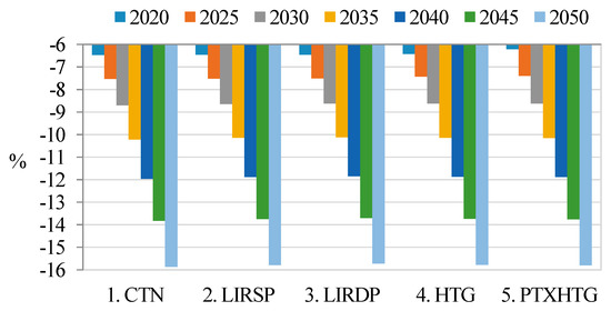 Figure 14 shows the percentage changes in the GINI index relative to the reference scenario. The carbon tax progressed slightly with no recycling because the carbon tax had more impact on high-income-level households. The income source of high-income groups came more from the enterprise revenue and capital gains than that of the low-income groups. Additionally, energy related firms belong to capital-intensive industry. The implementation of the carbon tax affects these enterprises directly. For recycling into labor income, the income distributions were very different depending on the proportion of the deduction for the household group. For the average deduction to all groups, the income distribution could worsen after 2040 because the high-income decile gained more. However, for more deduction on low-income level, the GINI index had a significant improvement over time. Obviously, transfer direct to the low-income group had the strongest effects on income distribution.
