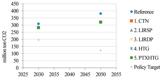 Concerning the environmental aspect (Figure 12), the reduction of CO2 emissions in each policy scenario was very similar. From 2020 to 2050, the percentage changes in CO2 emissions relative to the reference scenario were between −6% and −16%, whether the tax revenue was used to recycling or not. For climate change mitigation action in Taiwan, there are two main greenhouse gas reduction policies, the INDC and the Greenhouse Gas Reduction Act. These two polices aim to reduce 20% and 50% of the greenhouse emissions of 2005 by 2030 and 2050, respectively. Comparing the policy targets with the results (Figure 13), it was shown to be impossible to achieve the emission targets with the carbon tax assumed in this paper. More carbon tax, low carbon technology, or demand-side management in energy are needed to meet the reduction target. Alternatively, it means the INDC and Greenhouse Gas Reduction Act policy targets in Taiwan are too high, especially under the nuclear-free homeland policy and with the limited renewable energy resources in Taiwan.