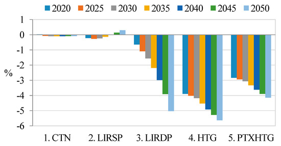 Figure 11 shows the percentage changes of the real GDP in each policy scenario relative to the reference scenario. The carbon tax would have more impact on the whole economy without the deductions of other taxes. The costs of energy products increased for all industries and households and caused a drop in the outputs of all productive activities with no tax recycling. By offsetting the labor income tax with the carbon tax revenue, the increasing disposable income would stimulate household purchasing and the real GDP would be raised through the industry linkage effects. However, if carbon tax revenue was used to subsidize the low-income group, it would not be significant for the improvement of the economy when implementing the carbon tax. As for the deduction in production tax, for enterprise, the reducing cost of energy input raised the total output. In the meanwhile, the rest of the tax revenue was used for transfer from government to low-income households. The real GDP in Taiwan would have a minor improvement after 2035 relative to the reference.