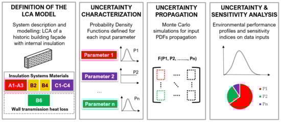 - Uncertainty characterization. The uncertain data inputs of the LCA model are identified, and specific procedures for their characterization through PDFs are proposed.