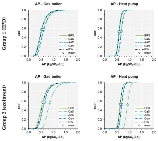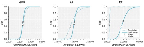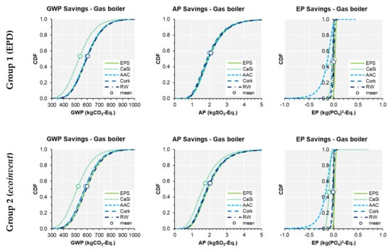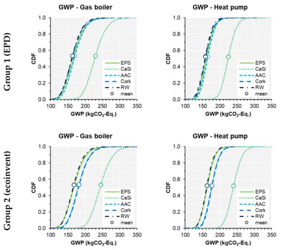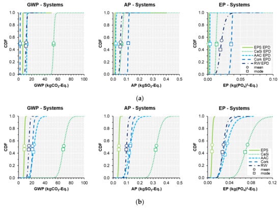 The results of the stochastic LCA of the insulation systems are presented both as probability distributions (defining the range and likelihood of impacts) and using a traditional “deterministic way”, representing the ranking of their environmental profiles based on the mean values of the distributions, in order to compare results’ effectiveness and representativeness.