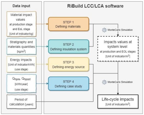 The environmental performance of internal insulation must be evaluated through a consolidated, comprehensive, and systematic method, in order to provide real decision support during the design stage. Life Cycle Assessment (LCA) is a standardized and internationally recognized method to quantify resource consumption, environmental impacts, and emissions linked to a product or service through its whole life cycle. Part of the RIBuild project includes the development of a stochastic approach for the assessment of the internal insulation hygrothermal performance [], life-cycle costs (LCC) [,], and life cycle environmental impacts (LCA) [], by coupling specific calculation models to Monte-Carlo (MC) simulation and Probability Density Functions (PDFs) for data inputs.
