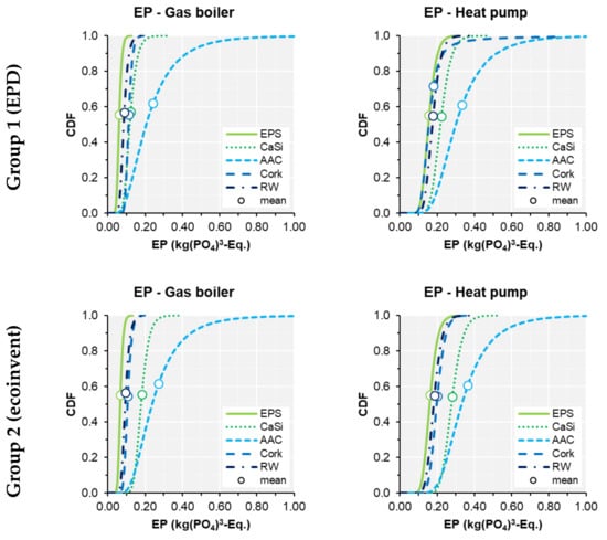 LCA results of the overall life cycle in terms of mean (μ), standard deviation (σ), and Coefficient of Variation (CV) of the obtained samples from MC simulation for the EP impact category, based on ecoinvent data (simulation group 2).
