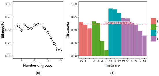 Example of the silhouette index of each cluster conducted in the study: (a) evolution of the average silhouette with variations of the number of groups; and (b) distribution of the silhouette in each town.