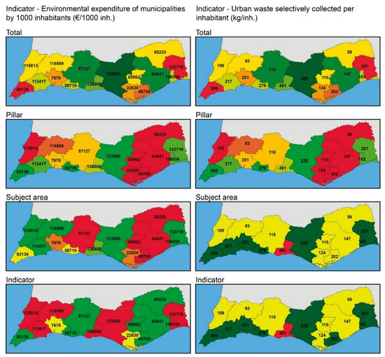 In the TA, groups with cities with a greater degree of similarity with cities from other groups were obtained. In this regard, in the environmental expenditure indicator, Alcoutim was grouped with the cities of Aljezur and Monchique, whose expenditure difference is greater than 50,580 €/inhab, whereas other cities with a very low difference (e.g., Tavira) were grouped with other cities. This aspect can also be seen in the urban waste selectively collected per inhabitant, as Portimão was grouped with Faro, whereas cities with closer values, such as Loulé, Olhão and Lagoa, were placed in different groups. In the PA (with the same classification in both indicators), there were also erroneous classifications, such as Silves with Pormtimão in the environmental expenditure and in the urban waste selectively collected. Regarding the SAA, there was an almost correct classification, and the classification was erroneous only in some cases, such as Olhão in urban waste selectively collected and Lagoa in expenditure. Finally, the most appropriate classification was obtained with the 1D approach.