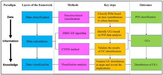 Given the aforementioned benefits, POI data were utilized in this study to link UC identification with urban function analysis. First, we extracted POI data from electronic map databases and classified them by their contributions to different urban functions. Based on their geographical proximities, POIs with similar urban functions were then grouped into a few functional UCs, using the DBSCAN algorithm. Next, CVNN was utilized to evaluate the effectiveness of UC identification. Lastly, spatial distributions of UCs with diverse urban functions were visualized on the ArcGIS platform. As summarized in Figure 1, the theoretical framework for UC identification divides into three layers—data classification, calculation, and visualization.