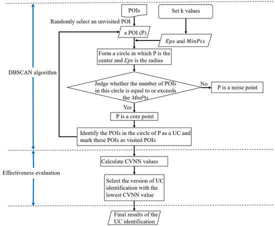 The DBSCAN algorithm was utilized to gather neighboring POIs into one UC, and CVNN was employed to evaluate the effectiveness of this UC identification. The DBSCAN algorithm originates from the field of knowledge discovery [40]. As one of the most widely used algorithms for clustering [41], DBSCAN can effectively extract useful information from a large amount of spatial data within a relatively short time [42,43]. In addition, DBSCAN is an unsupervised clustering algorithm, which does not rely heavily on researcher knowledge [30,44]. Therefore, this algorithm can be used to mitigate a researcher’s subjective biases. Given these benefits, DBSCAN was instrumental to this study.
