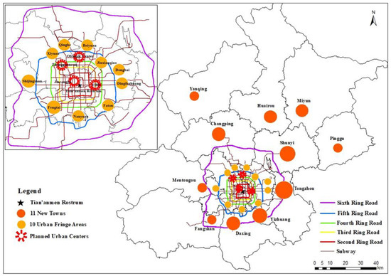 Situated in northern China, Beijing consists of 16 administrative districts and covers 16,410.54 km2 [52]. The city has six ring roads, with six administrative districts on the Sixth Ring Road—Xicheng, Dongcheng, Chaoyang, Haidian, Shijingshan, and Fengtai (see Figure 3). Typically, these districts are considered the inner city of Beijing. The economic conditions and infrastructure development of the six inner districts are better than those of the other districts. As a result, more than 55% of Beijing’s population concentrates in these districts [52], which presents a significant challenge to the urban functions of the traditional inner city, especially the core area within Fifth Ring Road.
