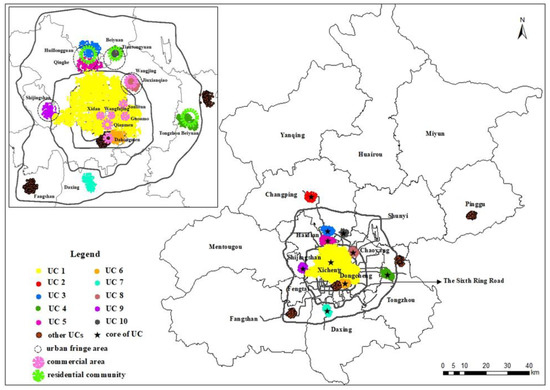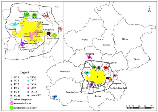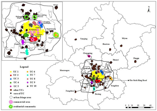 According to the 1991–2010, 2004–2020, and 2016–2035 Urban Master Plans of Beijing, ten urban fringe areas were developed to disperse the population of the inner city area [53]. As shown in Figure 5, residential decentralization of the inner city is significantly aided by five urban fringe areas—Shijingshan, Qinghe, Fengtai, Qingfuzhuang, and Jiuxianqiao. Moreover, the majority of these fringe areas are covered by residential UCs. Additionally, 11 new towns have been established to motivate urban residents to relocate from the inner city to areas outside of Sixth Ring Road. Residential UCs have been developed in three new towns—Huairou, Minyun, and Changping—which emerged as a result of the new town development policies. However, the biggest residential UCs (i.e., with 9109 POIs) are located within Fifth Ring Road, the core area of the inner city. By contrast, the residential UCs of the three new towns only have 801 POIs. Such unbalanced distribution of residential resources implies that the contribution of these new town development policies has been relatively limited.