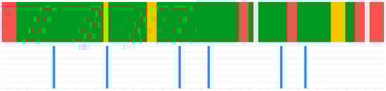 Emotional status of a worker on a working day. The green (happy), red (angry), yellow (relaxed), and gray (neutral) colors represent the distribution of workers’ in-the-moment emotional states during a day. The blue bar underneath the emotion graph indicates the amount of conversation. The horizontal line shows the time span during a day, and the vertical line shows workers’ emotional status and conversation during that time.
