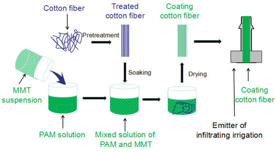 The key water-conducting material was composed of PAM and MMT. The preparation process is shown in Figure 1. First of all, 0.2% PAM solution was prepared by stirring and heating at 40 ℃ for 20 min, and then left for 12 h. Then 1% MMT suspension was prepared by magnetically stirring for 20 min and ultrasonically stirring for 10 min. After that, the PAM solution was slowly poured into MMT suspension by stirring for 15 min until the mixture was uniform. The optimum ratio of PAM to MMT was 1:4. Secondly, the cotton fibers were soaked in 14% sodium hydroxide solution for 30 min to remove the oil adsorbed on the surface, then neutralized in 5% glacial acetic acid and washed with clean water. Then the pretreated cotton fibers were soaked in PAM/MMT mixed colloid solution for 10 min and then dried in an oven for 8 h. Lastly, the water-conducting fibers were filled into the self-made infiltrating irrigation emitter, and the infiltrating irrigation system was composed of the emitters and the pipelines. The structure diagram of infiltrating irrigation emitter was shown in Figure 2, and the diagrammatic sketch is shown in Figure 3.