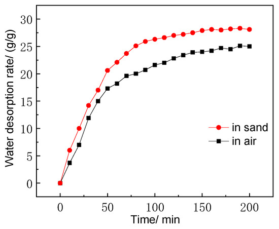 As seen in Figure 4, the material absorbed water rapidly from the beginning to the 40th minute when the water absorption speed began to decrease, and then gradually becoming saturated after 130 min. After that, the water absorption rate had no obvious change with time, the saturated water absorption capacity reached 36 g/g. Figure 5 shows the water desorption performances in air and in dry sand. The material maintained a high speed of water lose from the beginning to the 70th minute, and then the speed of water loss gradually decreased until the water loss process basically finished at 170th minute. As the suction in dry sand is greater than in air, the maximum water loss reached 25 g/g in air and 27 g/g in sand. The most important quality for the key materials is the water-conducting performance, so its water absorption and water desorption performances should be balanced. For the water-conducting material, both water absorption performance and water desorption performance were acceptable.